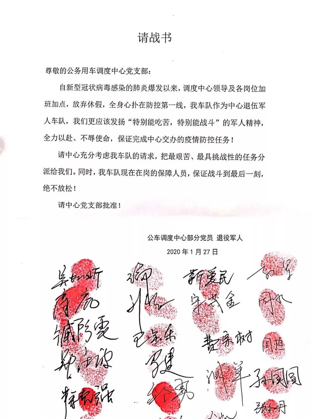 “請把最艱苦、最具挑戰(zhàn)性的任務(wù)分派給我們,我們必定全力以赴、不辱使命,保證完成組織交辦的各項(xiàng)疫情防控任務(wù)”。1月27日,公車調(diào)度中心23名黨員同志向黨支部遞交了一份印滿紅手印的“請戰(zhàn)書”,短短百余字,字字鏗鏘,句句深情。他們中有工作經(jīng)驗(yàn)豐富的“60后”、有剛走上工作崗位的“95后”、有兩歲孩童的媽媽、有備受父母寵愛的女兒......但此刻,面對這場無聲的“戰(zhàn)役”,他們不忘自己更是一名黨員、是退役軍人、是勇往直前的“戰(zhàn)士”,他們迫切希望加入黨支部的疫情防控黨員先鋒隊(duì),為打贏這場疫情防控阻擊戰(zhàn)貢獻(xiàn)自己的力量。