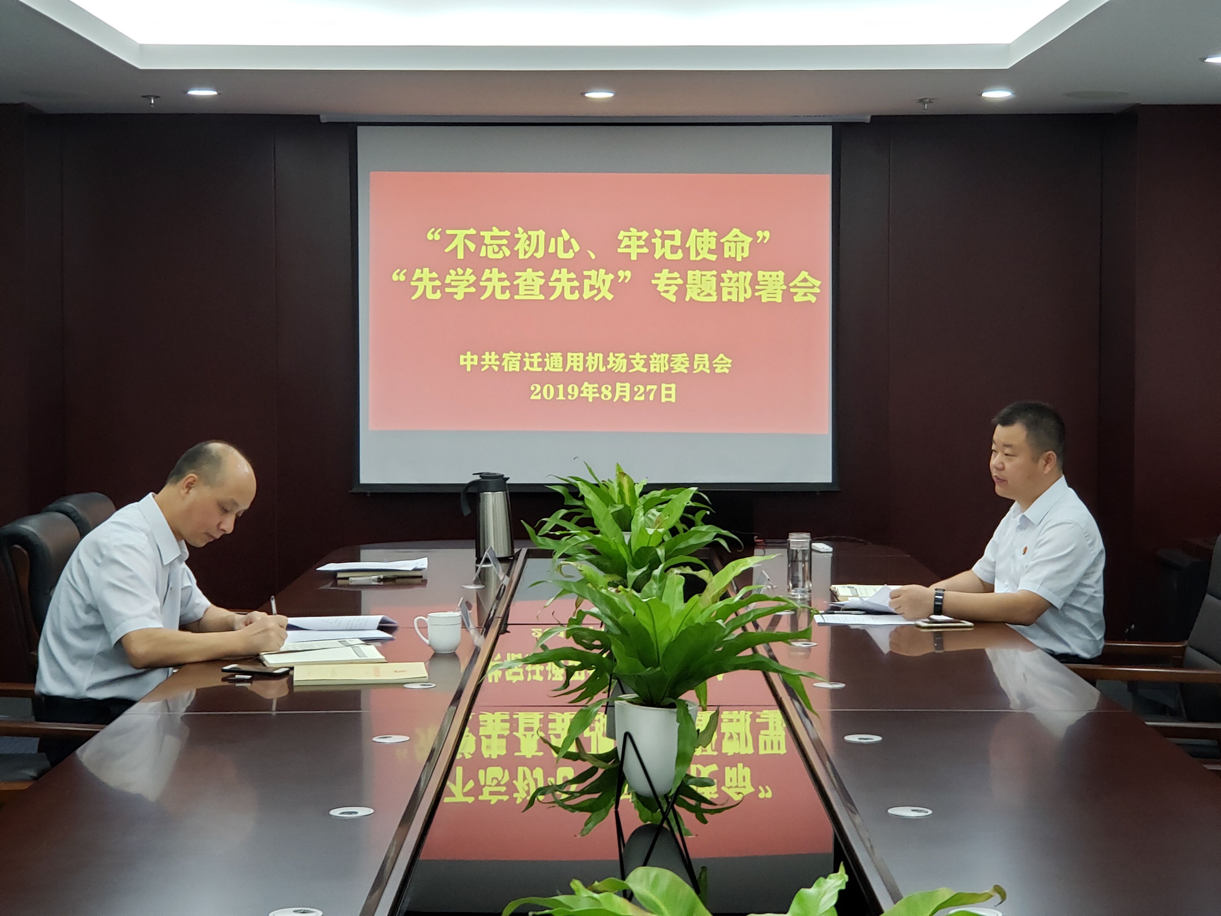 為貫徹落實《關于在第二批“不忘初心、牢記使命”主題教育前開展“先學先查先改”活動的通知》精神,宿遷市洋河通用機場公司黨支部于8月27日上午, 組織召開“不忘初心、牢記使命”主題教育 “先學先查先改”工作專題部署會。