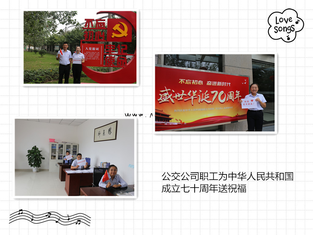 公交公司還在301路“西楚清風(fēng)號”及201路“紅旗車隊(duì)”公交車內(nèi)懸掛國旗,組織各崗位員工為中華人民共和國成立70周年送上祝福,表達(dá)對黨、對國家的熱愛。