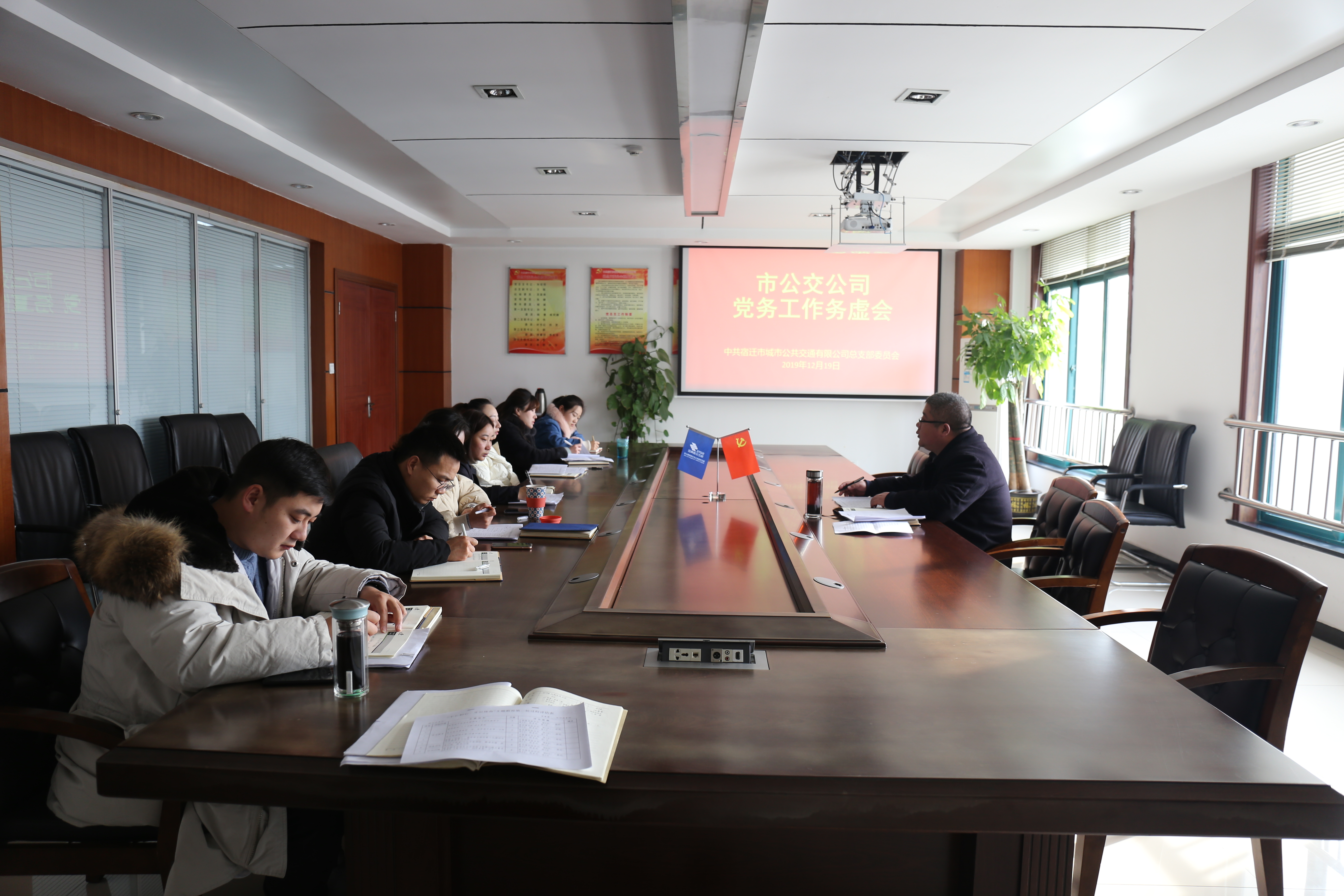 為圓滿完成公司2019年度黨建工作目標任務,進一步明確2020年黨建工作思路,12月19日上午,市公交公司黨總支根據市交通集團黨委《關于開展12月“主題黨日”活動的通知》和公司全年黨建工作計劃部署,召開黨務工作務虛會。公司黨總支副書記、四個支部書記以及專職黨務工作者參加會議。