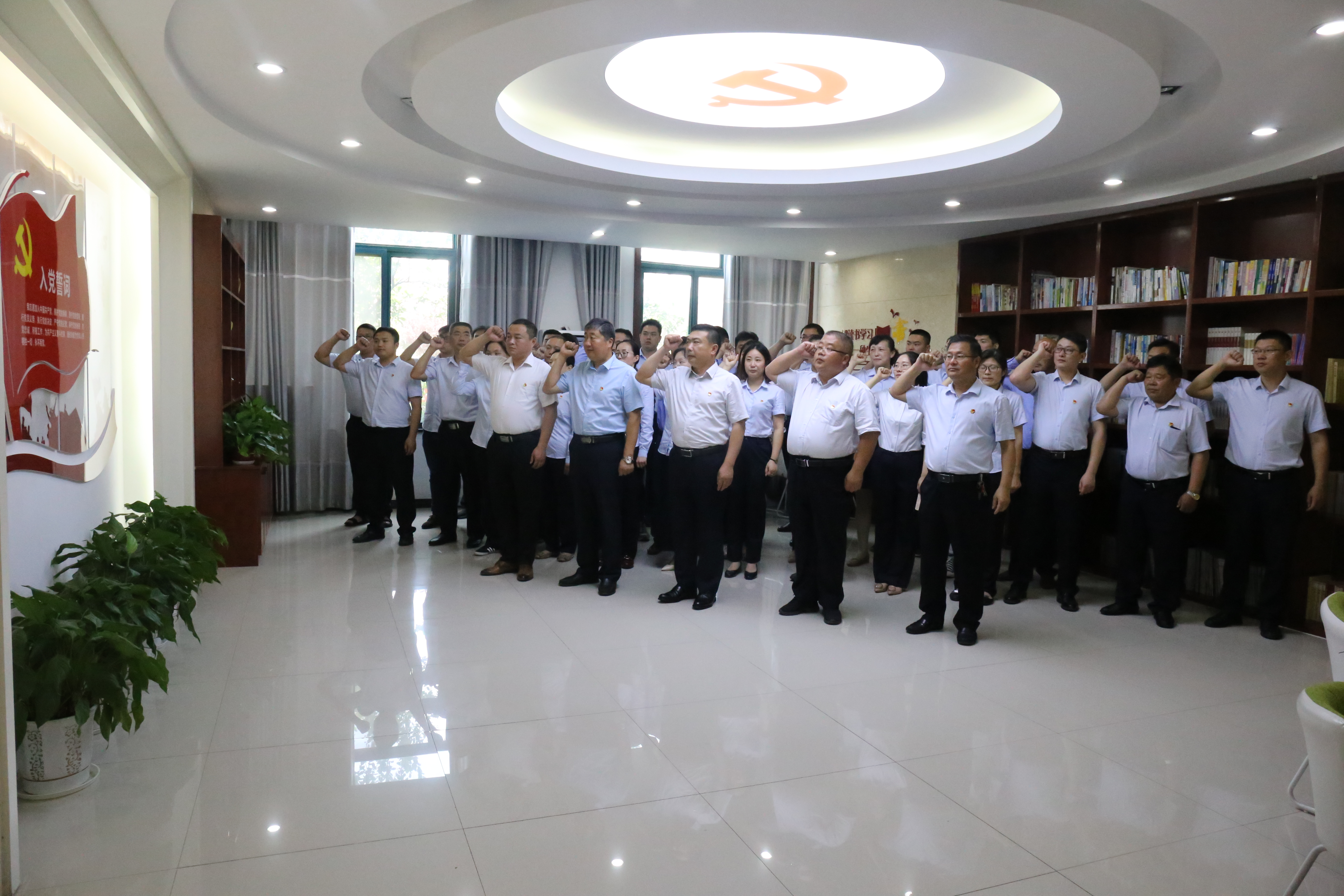 在職工書屋內(nèi),公交公司黨總支書記朱宗明帶領(lǐng)50余名黨員在黨旗下莊嚴宣誓。激昂的宣誓聲,讓全體黨員接受了一次精神上的教育和洗禮,更加堅定了理想信念。