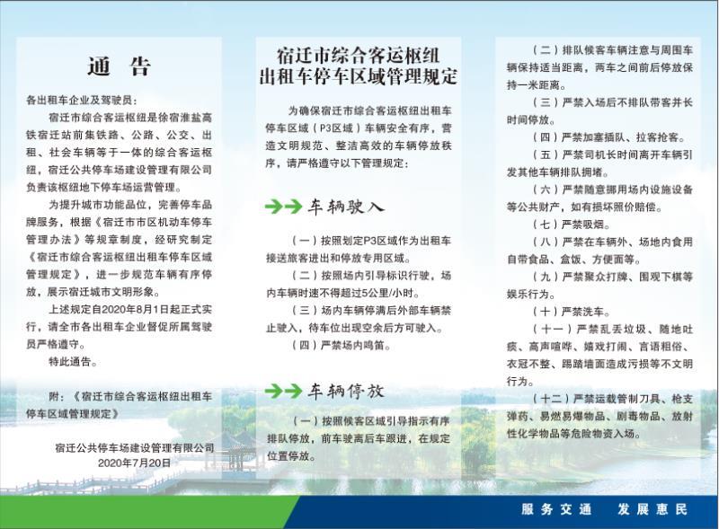宿遷市綜合客運(yùn)樞紐正式啟用以來(lái),為市民出行提供了極大便利。隨著高鐵線路班次的不斷優(yōu)化,乘車人數(shù)不斷增多,出租車用車需求攀升,對(duì)優(yōu)化該樞紐地下停車場(chǎng)停車管理水平提出了更高要求。為著力提升文明形象,結(jié)合場(chǎng)內(nèi)出租車停車區(qū)域(P3區(qū)域)運(yùn)營(yíng)管理實(shí)際情況,根據(jù)《宿遷市市區(qū)機(jī)動(dòng)車停車管理辦法》等規(guī)章制度,宿遷停車場(chǎng)公司升級(jí)“宿遷好停車”品牌運(yùn)營(yíng)管理服務(wù),研究制定《宿遷市綜合客運(yùn)樞紐出租車停車區(qū)域管理規(guī)定》(以下簡(jiǎn)稱《規(guī)定》),并于2020年8月1日起正式施行。