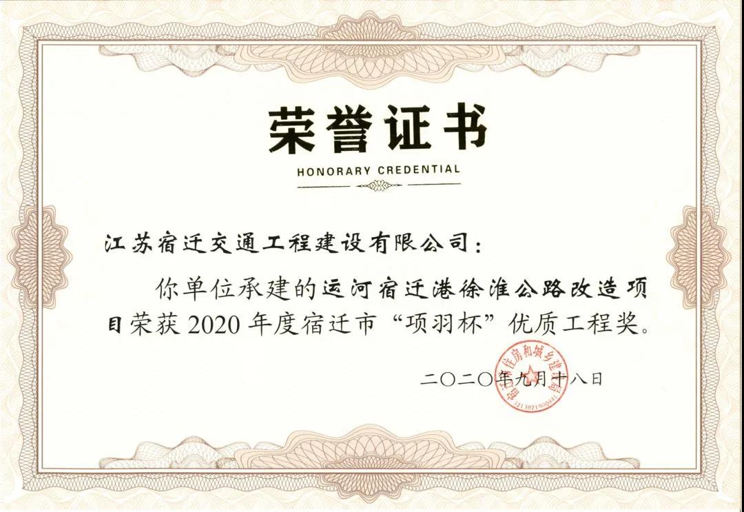 近日,由宿遷交建承建的環(huán)駱馬湖旅游公路皂河船閘至黃墩李甸段工程和運(yùn)河宿遷港徐淮公路改造項(xiàng)目榮獲2020年度宿遷市“項(xiàng)羽杯”優(yōu)質(zhì)工程獎(jiǎng)。