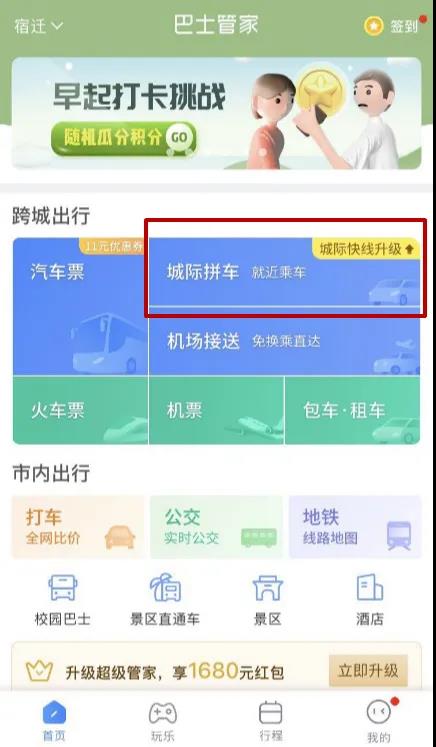 步驟一:打開“巴士管家”APP或“巴士管家”微信小程序,選擇“城際拼車;