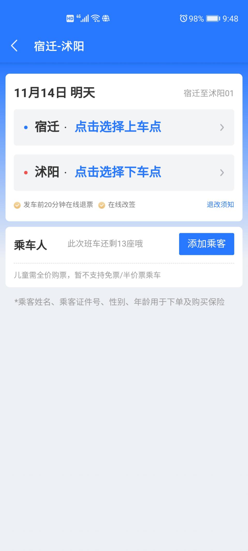 步驟四:選擇上車、下車站點(diǎn),填寫乘車人信息;