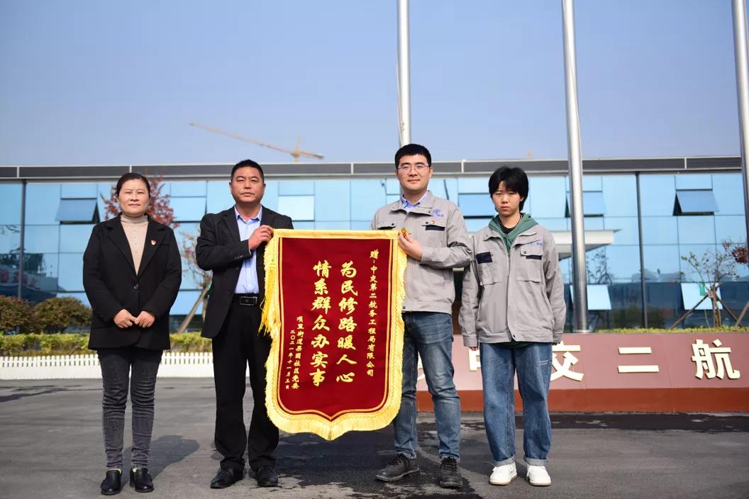 沒過幾天,宿城區(qū)項(xiàng)里街道果園社區(qū)工作人員將一面錦旗送到北京路快速化改造工程中交二航局項(xiàng)目部,感謝該項(xiàng)目部幫助解決群眾出行難題。