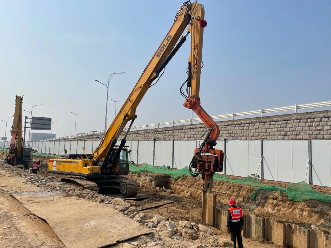 現(xiàn)場正在進行鋼板樁施工作業(yè),打樁機將鋼板樁一根根地打入土中,聲音鏗鏘有力。為高質量完成項目前期工作,項目部全體人員春節(jié)假期堅守崗位,三場建設、道路銑刨、道路導改等工作同步進行。截至目前,該標段三場灰土大棚建設完成,水穩(wěn)拌合站組建工作完成70%,瀝青面層和水穩(wěn)碎石銑刨完成1.5立方千米。