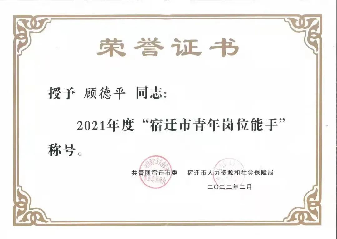 【宿遷交建】宿遷交建顧德平榮獲2021年度“宿遷市青年崗位能手”稱號(hào)