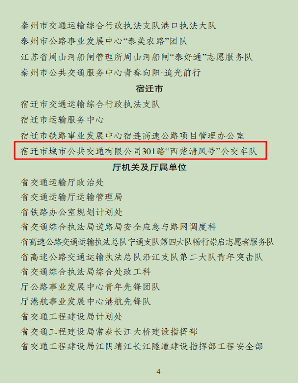 近日,省交通運(yùn)輸行業(yè)黨委發(fā)布《關(guān)于表?yè)P(yáng)全省交通運(yùn)輸行業(yè)青年建功標(biāo)兵團(tuán)隊(duì)和青年建功標(biāo)兵個(gè)人的通報(bào)》,公交公司301路“西楚清風(fēng)號(hào)”公交車(chē)隊(duì)榮獲“全省交通運(yùn)輸行業(yè)青年建功標(biāo)兵團(tuán)隊(duì)”稱(chēng)號(hào)。