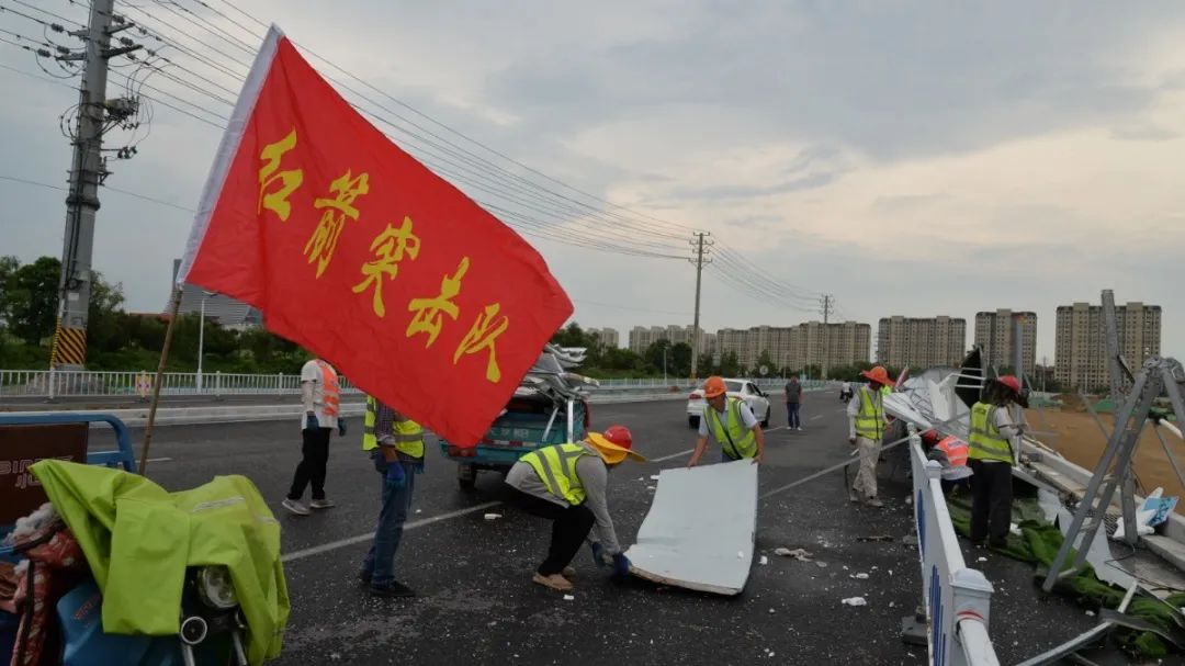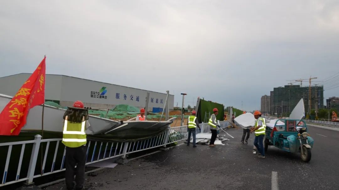 在狂風(fēng)和暴雨的雙重襲擊下,現(xiàn)場的圍擋出現(xiàn)了部分倒伏損毀的情況,面對現(xiàn)場的情況,宿遷交建工程項(xiàng)目黨支部迅速組織“紅箭突擊隊(duì)”第一時(shí)間趕往現(xiàn)場,全體黨員顧不上圍擋上鋒利的邊角和突出的螺釘,抓緊時(shí)間對損壞處進(jìn)行清理和維護(hù),及時(shí)消除道路安全隱患,確保現(xiàn)場道路交通通暢。