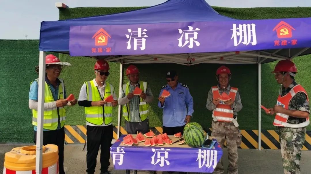 在公司迎賓大道二期快速化改造工程施工現(xiàn)場,“黨建·家”清涼棚出現(xiàn)在工地的多個角落,棚內(nèi)常備西瓜、礦泉水、藿香正氣液等防暑降溫物品,來往的施工人員熱了渴了,來到棚內(nèi)喝上幾口茶,吃上幾口瓜,消了暑繼續(xù)為項目建設(shè)貢獻(xiàn)自己的力量。
