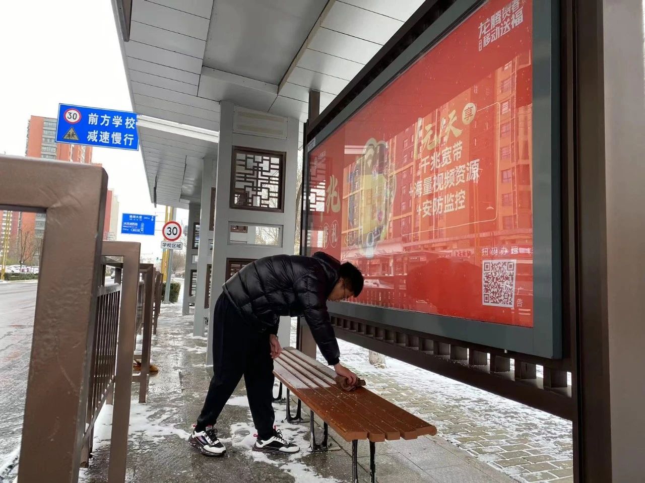 對(duì)公交候車亭進(jìn)行清掃