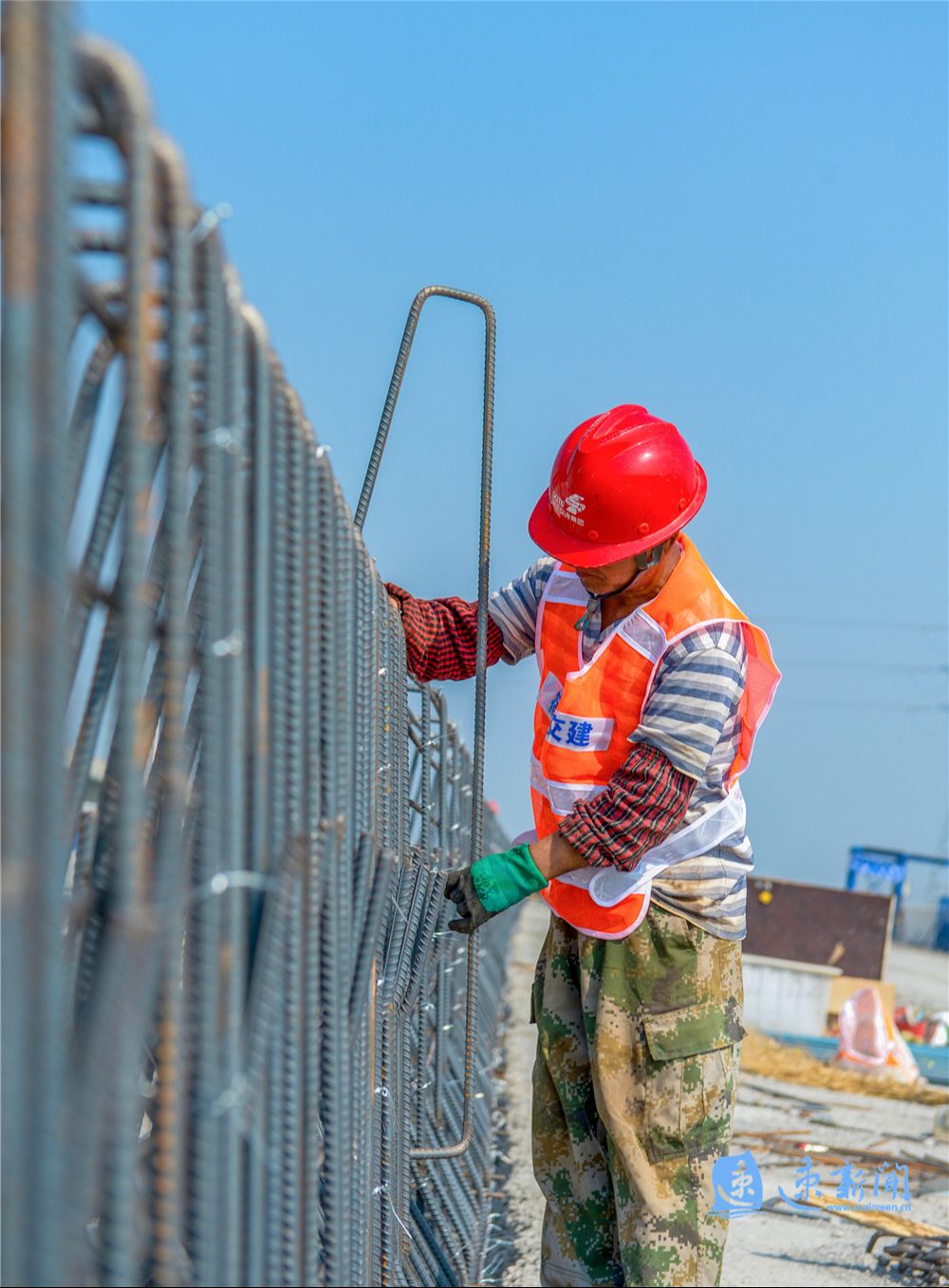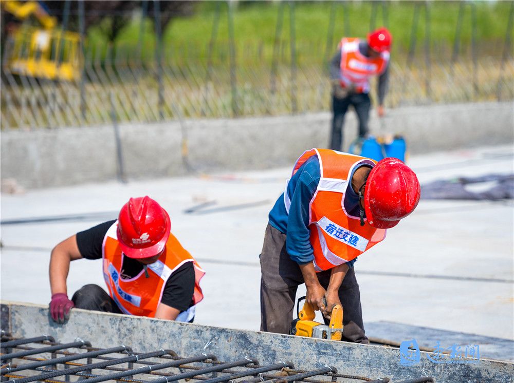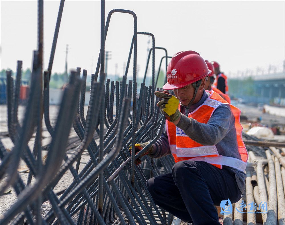 5月23日,在宿遷市港城路上跨鐵路專用線橋梁工程建設現場,工人正在緊張施工,一派熱火朝天的景象。
