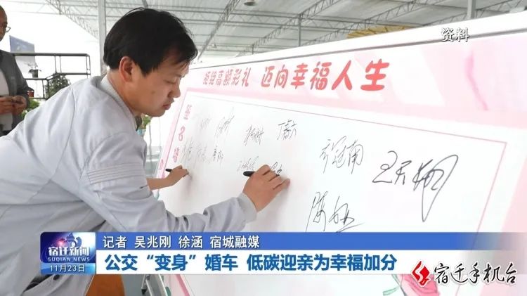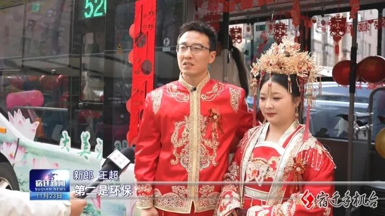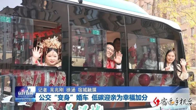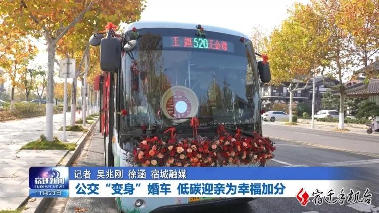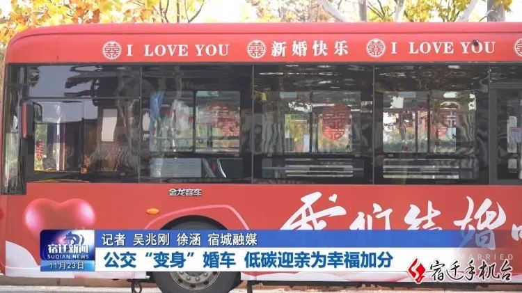 11月22日上午,在宿城區(qū)一家酒店門(mén)前,兩輛精心裝飾過(guò)的新能源公交車(chē)格外醒目,車(chē)頭系著大紅花,車(chē)窗貼著大紅“囍”字,車(chē)內(nèi)掛滿吉祥祝福,以往用來(lái)顯示公交線路的LED屏,變成了見(jiàn)證兩位新人幸福時(shí)刻的“520專列”。伴隨著吉時(shí)到來(lái),一對(duì)新人被親朋好友簇?fù)碇哌M(jìn)公交婚車(chē),駛向婚禮現(xiàn)場(chǎng),車(chē)內(nèi)到處是笑聲與祝福聲。