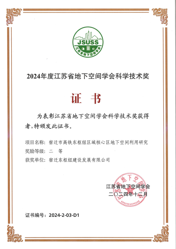 近日,江蘇省地下空間學(xué)會二屆二次理事會暨2024年度江蘇省地下空間學(xué)會科學(xué)技術(shù)獎頒獎表彰大會在南京召開,東樞紐公司的“宿遷市高鐵東樞紐區(qū)域核心區(qū)地下空間利用研究項(xiàng)目”榮獲二等獎。