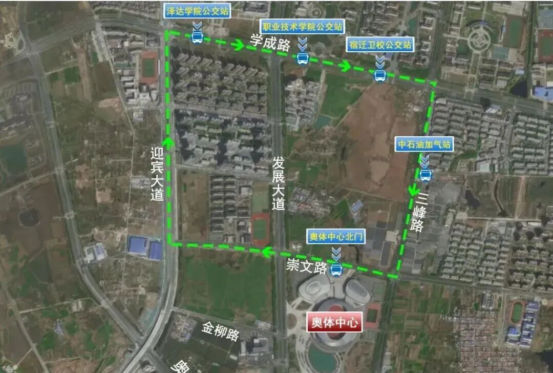 學(xué)成路停車區(qū)—奧體中心(循環(huán)擺渡):迎賓大道——學(xué)成路——三峰路——崇文路(奧體北門)