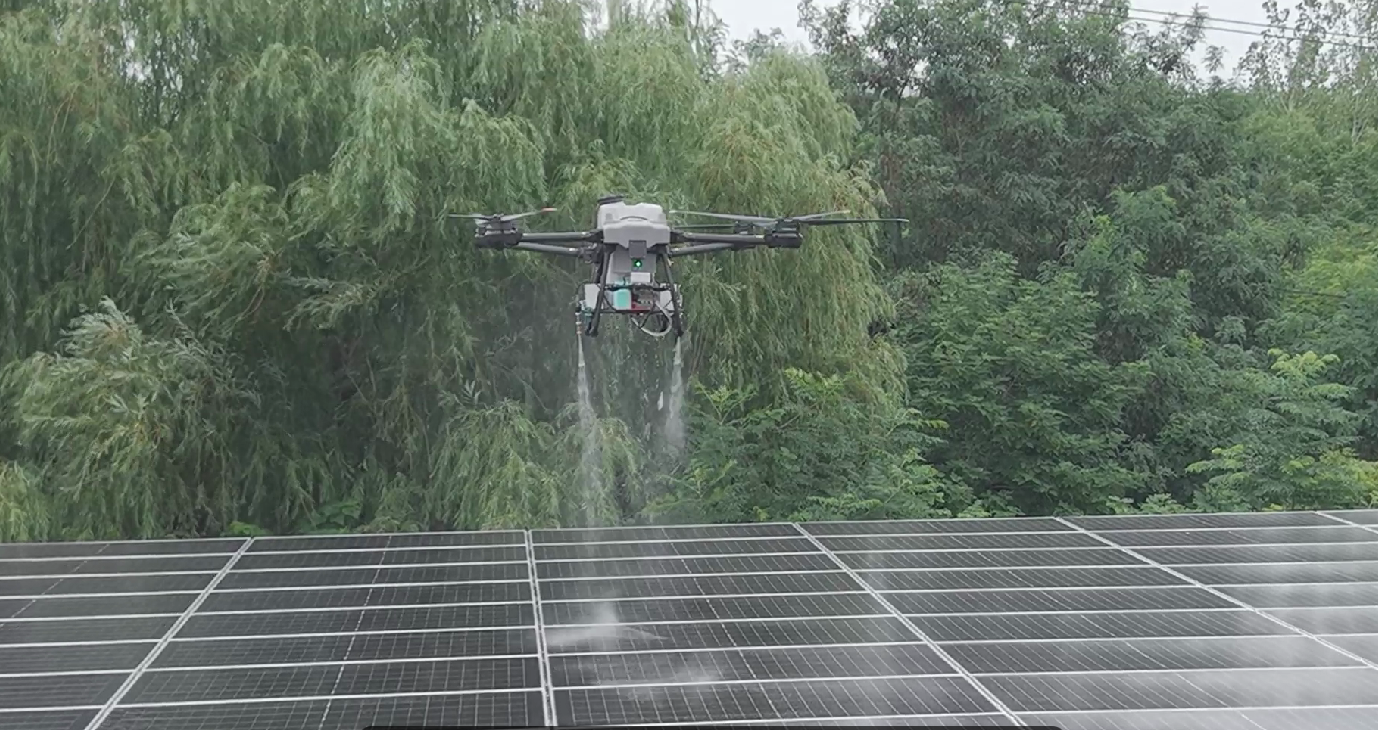 在光伏電站,無人機則變身“清潔能手”,開展光伏板清洗作業(yè)。它能夠精準定位光伏板上的污垢和灰塵,隨后配合高壓水槍與特制清潔液,高效且安全地完成清洗任務。