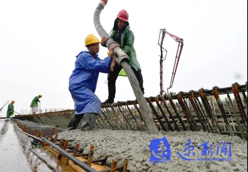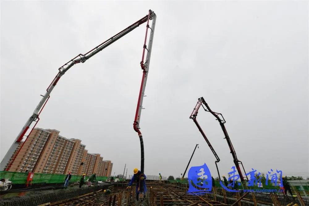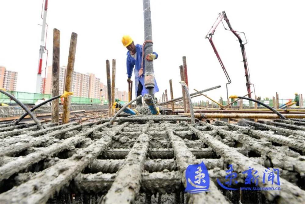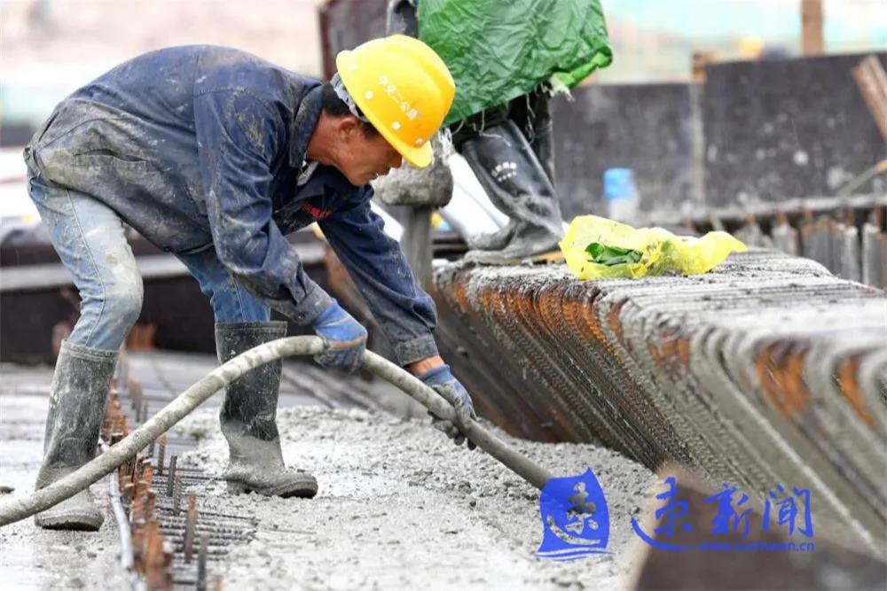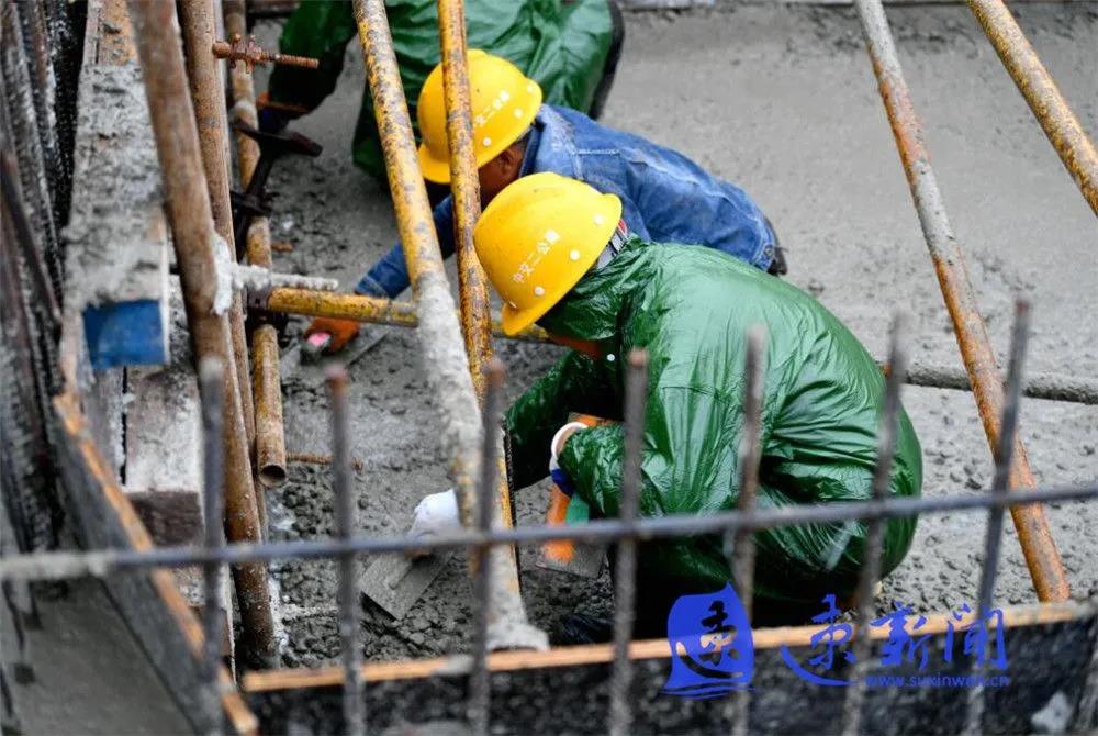 10月3日,宿遷市上海路(高鐵站連接線)改造二期工程項目工地工人正在雨中進行施工作業(yè),混凝土澆筑、起重機運轉(zhuǎn)、工程車往返,呈現(xiàn)出一派熱火朝天的勞動場景。