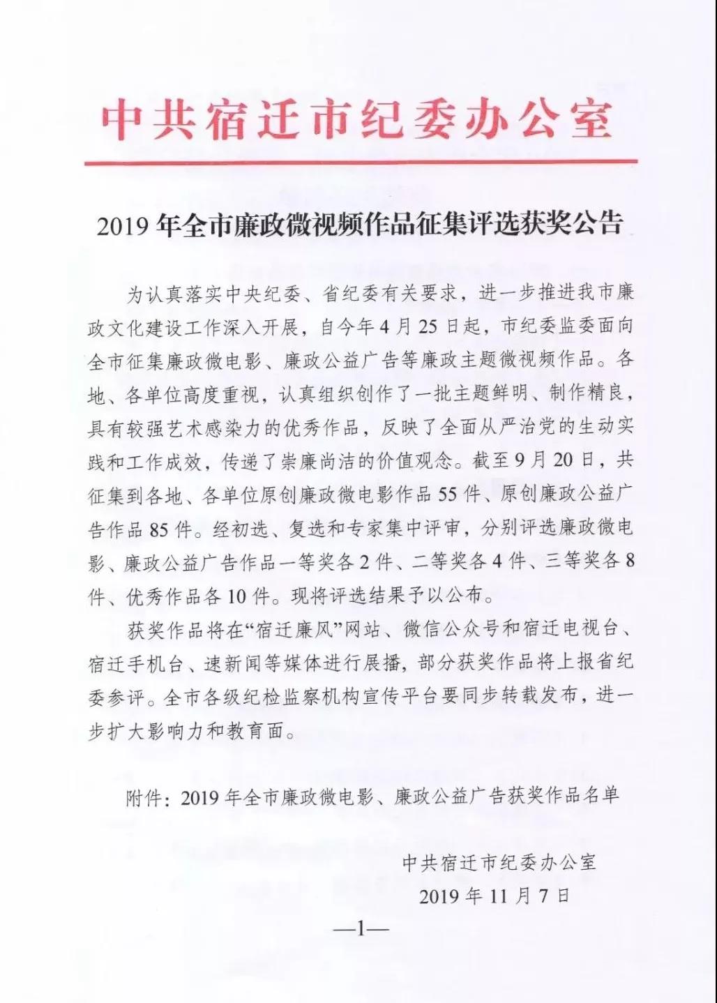 11月7日,宿遷紀委公布2019年全市廉政微視頻評選結(jié)果,集團報送的參賽作品《路》、《責任》分別榮獲廉政公益廣告二等獎、廉政微電影優(yōu)秀作品的佳績。