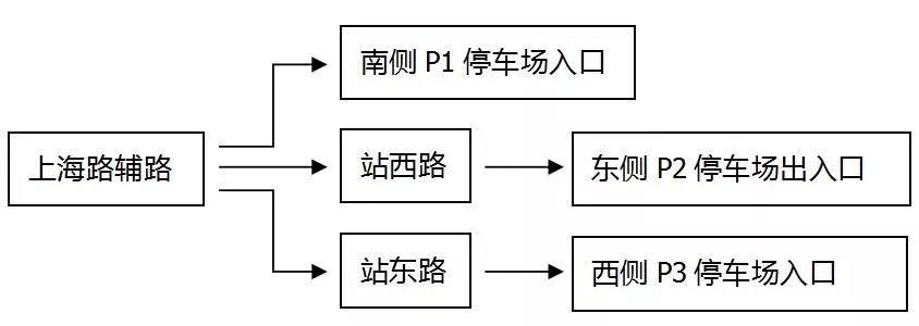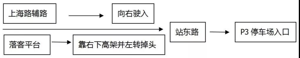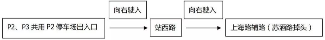 P2和P3停車庫共用一個出口,返程路線為從P2停車庫出口出,右轉(zhuǎn)進入站西路后再右轉(zhuǎn)進入上海路輔路,在上海路與蘇酒路交叉口掉頭,按照指示標志進入主線或轉(zhuǎn)入其他道路。