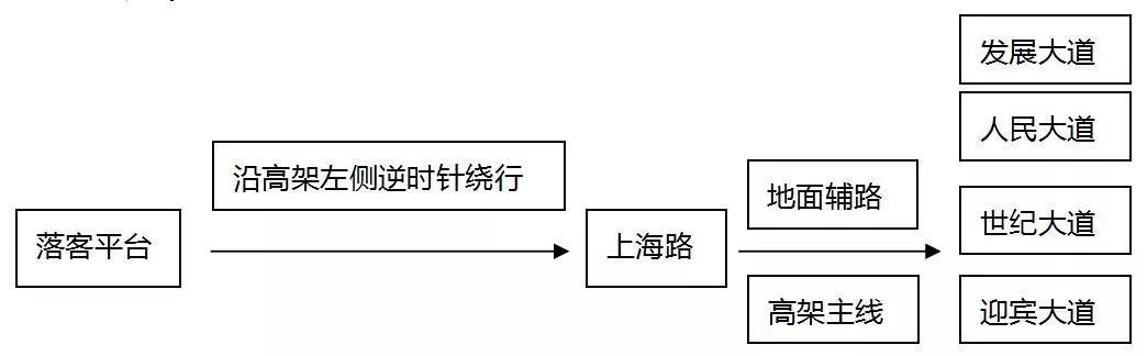 排隊等待區(qū)接到客人后,出租車進入站東路后右拐行至與蘇酒路交叉口,左拐進入蘇酒路后再左拐進入上海路地面輔路,按照指示標志轉(zhuǎn)至發(fā)展大道、人民大道、世紀大道或迎賓大道。