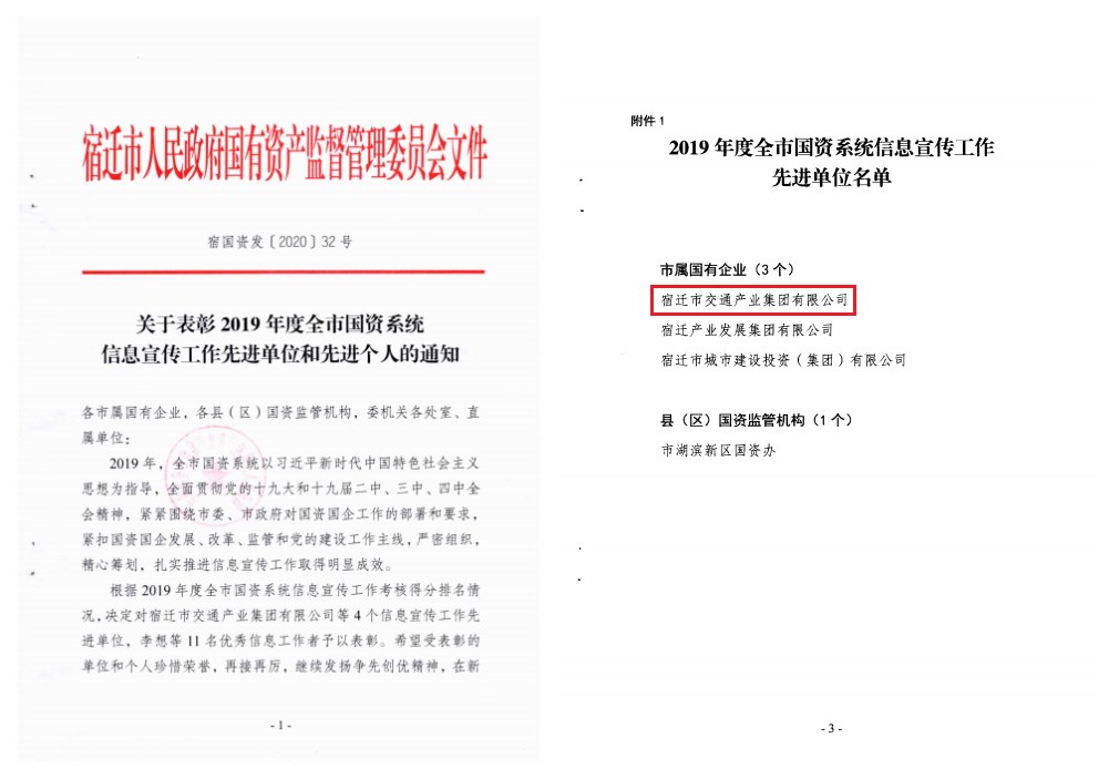 近日,宿遷市國資委發(fā)布《關(guān)于表彰2019年度全市國資系統(tǒng)信息宣傳工作先進(jìn)單位和先進(jìn)個(gè)人的通知》,市交通集團(tuán)以考核得分排名第一的好成績(jī),榮獲2019年度信息宣傳工作先進(jìn)單位。