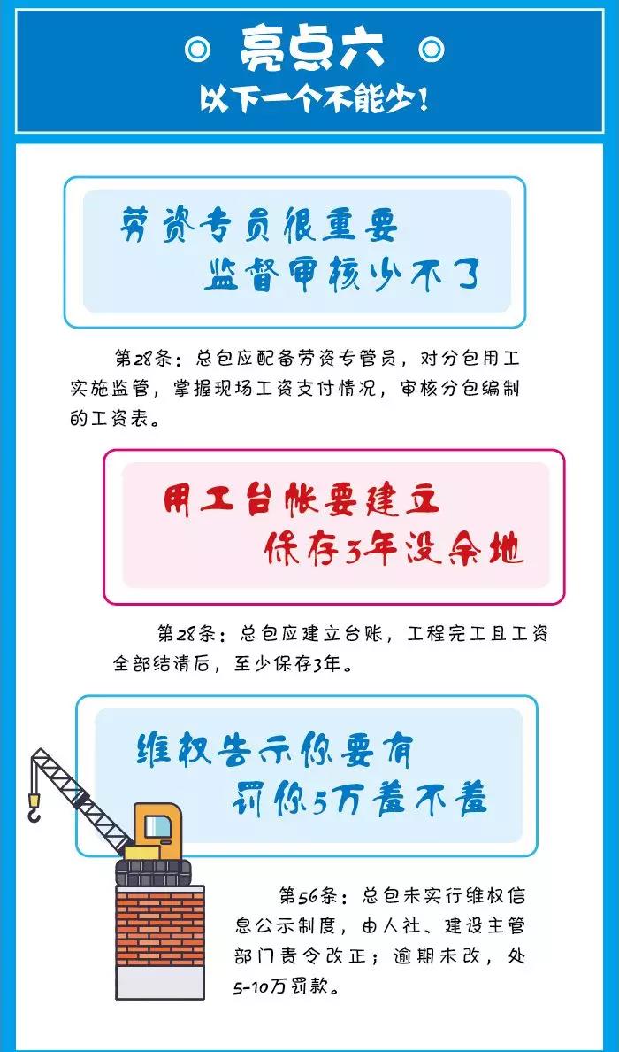 上述規(guī)定確立了總包對(duì)分包的用工及工資支付進(jìn)行監(jiān)督管理的責(zé)任,總包及分包均應(yīng)當(dāng)建立管理臺(tái)帳,并予以保存。農(nóng)民工維權(quán)信息指示牌要在工程項(xiàng)目中進(jìn)行展示,要明確告知農(nóng)民工的的維權(quán)途徑,否則要被處以相應(yīng)的罰款。