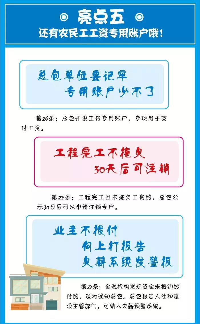 上述條款明確來(lái)總包設(shè)立農(nóng)民工工資專用賬戶的義務(wù),專門(mén)用于支付農(nóng)民工工資,建設(shè)單位應(yīng)按照合同約定及時(shí)向該賬戶內(nèi)撥付工資,如建設(shè)單位未及時(shí)撥付,總包單位可向人社和建設(shè)主管部門(mén)進(jìn)行匯報(bào),將建設(shè)單位納入欠薪預(yù)警系統(tǒng)。