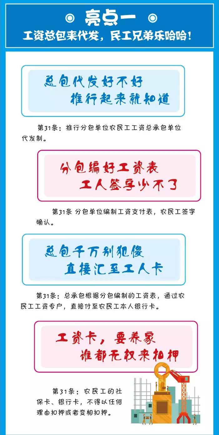 該條規(guī)定了總承包單位代分包單位發(fā)放分包單位所招用的農(nóng)民工的工資,分包單位每月要將農(nóng)民工簽字確認(rèn)的工資表交給總包,總包直接將工資發(fā)放到農(nóng)民工的工資卡里面,也就是說(shuō)總包要將工資單獨(dú)拎出來(lái)由其對(duì)外直接予以發(fā)放,不再由分包單位發(fā)放,這樣可以確保農(nóng)民工能實(shí)實(shí)在在的拿到工資,而且任何單位和個(gè)人均不得扣押農(nóng)民工的工資卡,條例也規(guī)定了對(duì)扣押工資卡的處罰措施。