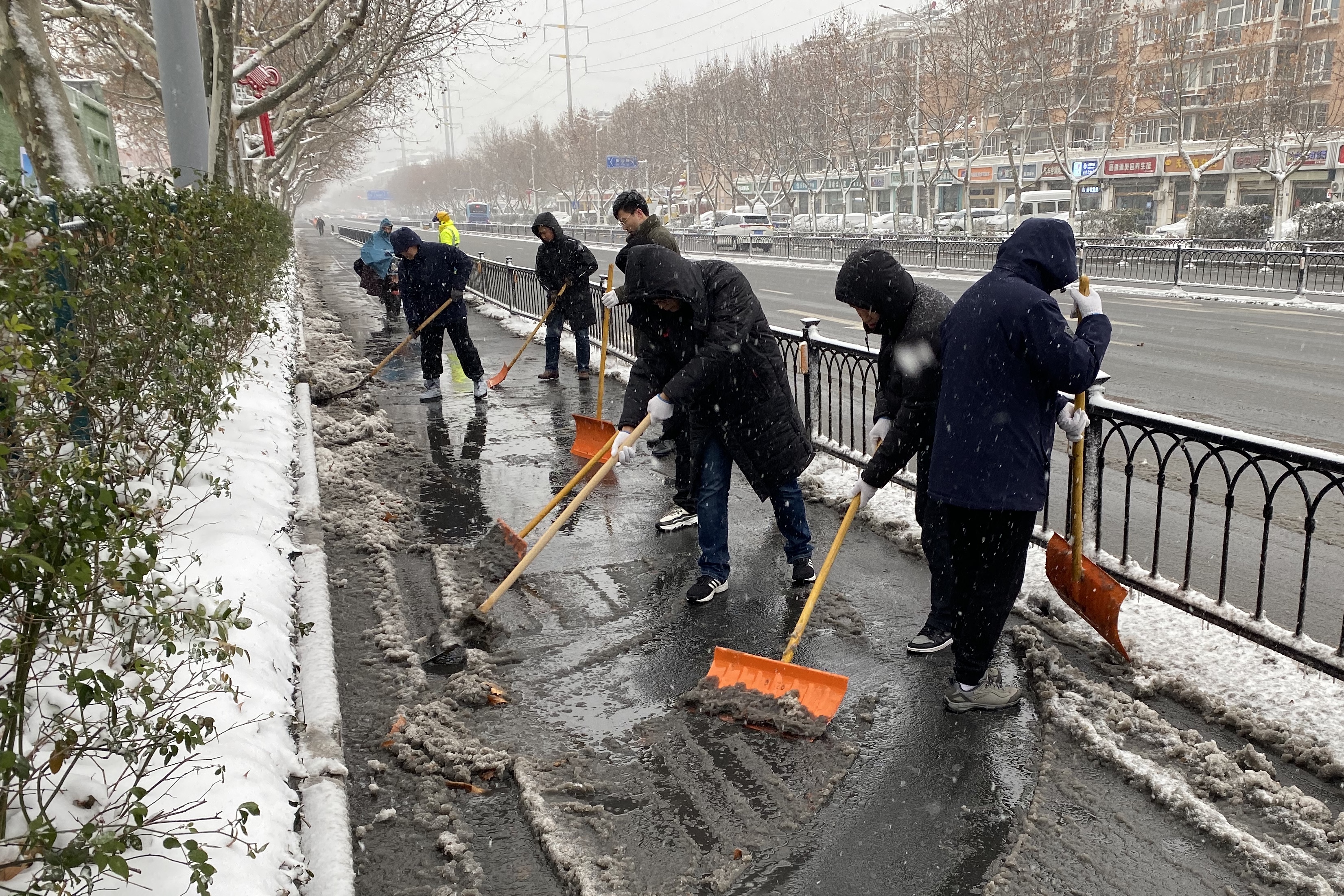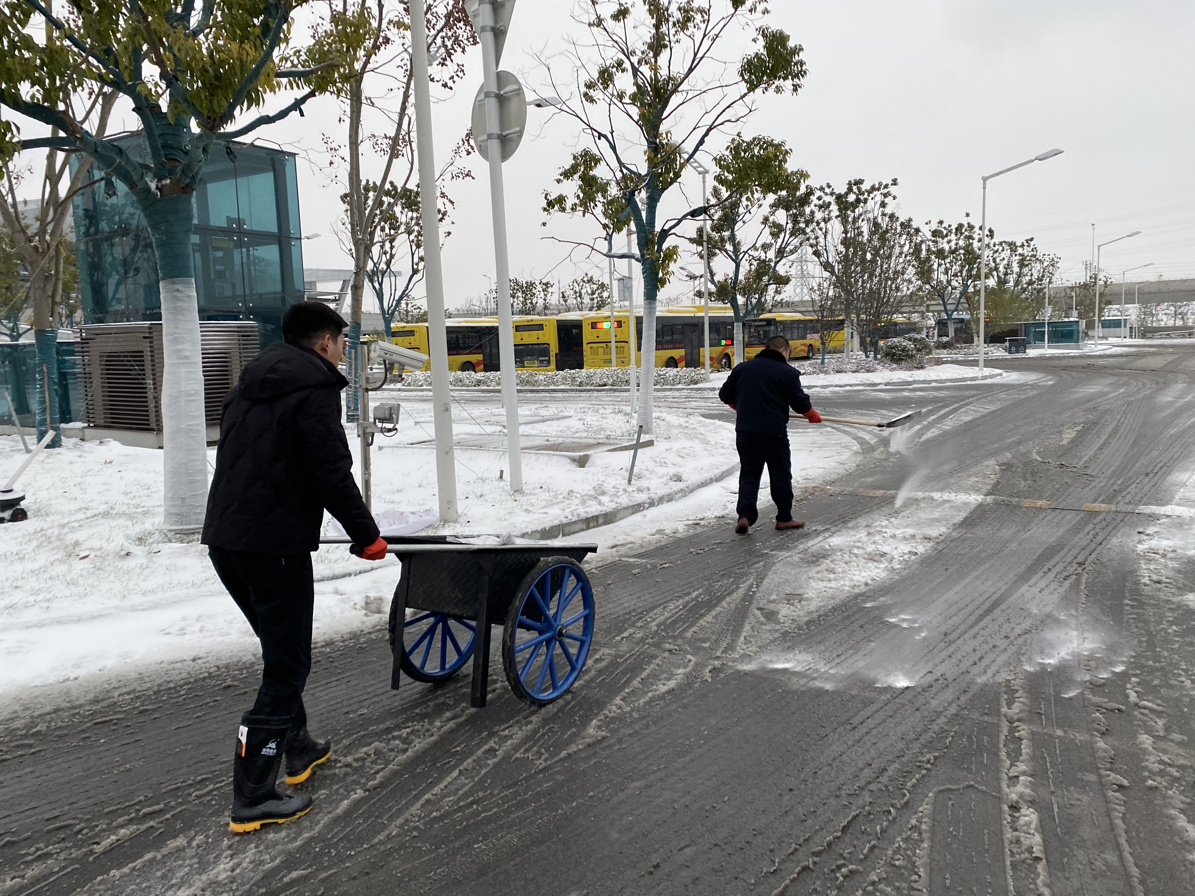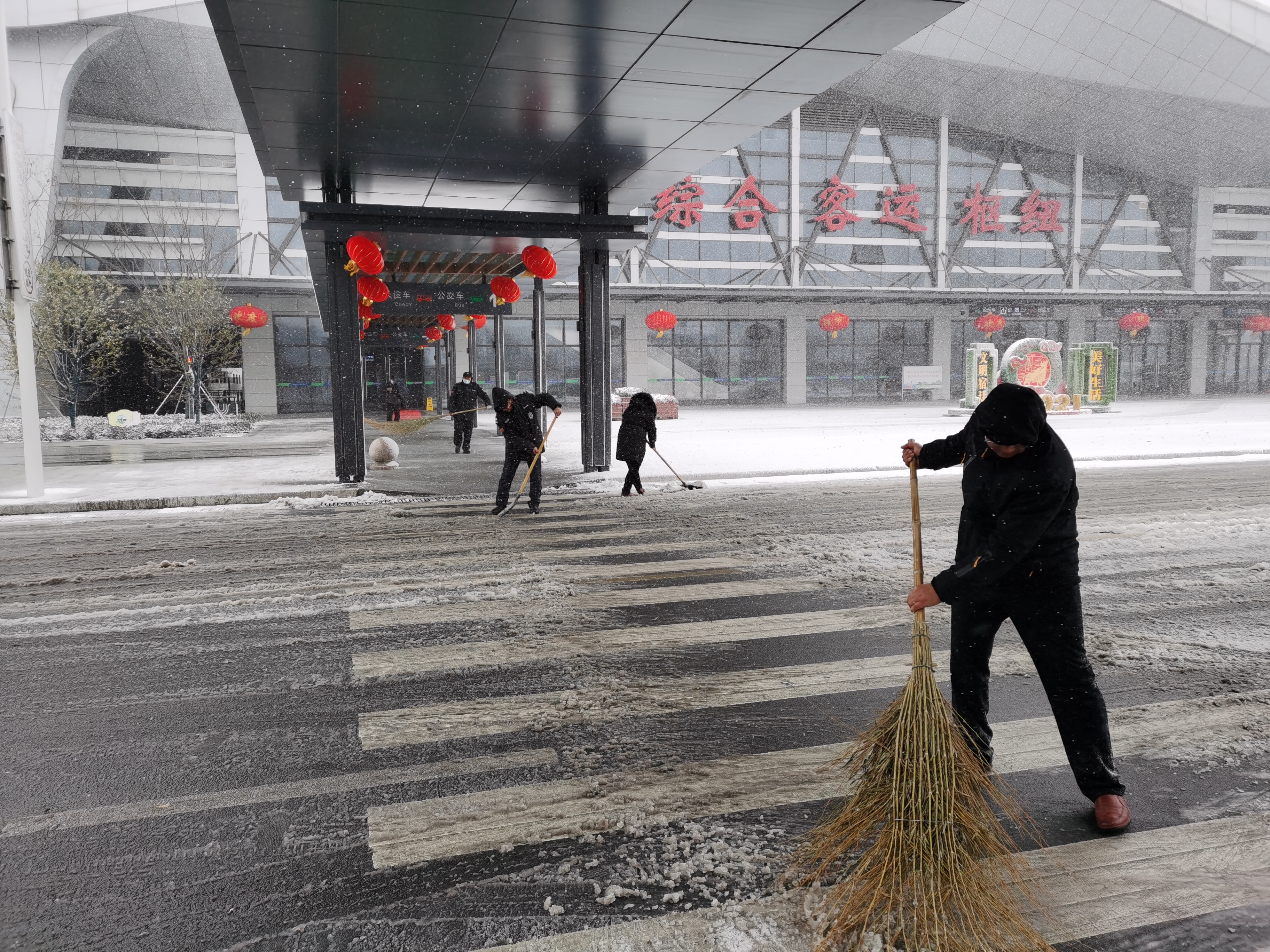 高鐵公司組織在崗職工和物業(yè)人員,利用推雪鏟、鐵鍬、掃帚等將高鐵宿遷站站前廣場(chǎng)積雪鏟開,對(duì)綜合客運(yùn)樞紐外道路、公交停車場(chǎng)等易結(jié)冰的路面進(jìn)行撒融雪處理,確保旅客出行安全。