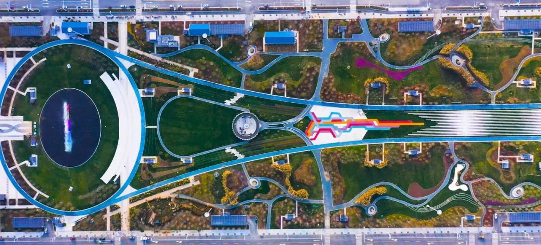 藍(lán)天白云之下,市高鐵商務(wù)區(qū)酒都廣場(chǎng)的彩色瀝青道路與綠化景觀相得益彰、渾然一體。