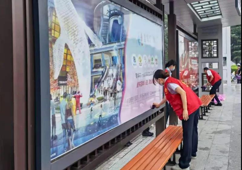 活動中,黨員志愿者們統(tǒng)一穿戴志愿服務(wù)馬甲,拿著抹布、水桶、掃帚等工具對洪澤湖路段公交候車亭、電子站牌、公益畫面、凳子及周邊環(huán)境進行清理,更換新的公益畫面幅。經(jīng)過半天的清理打掃,公交候車亭的活動區(qū)域煥然一新。