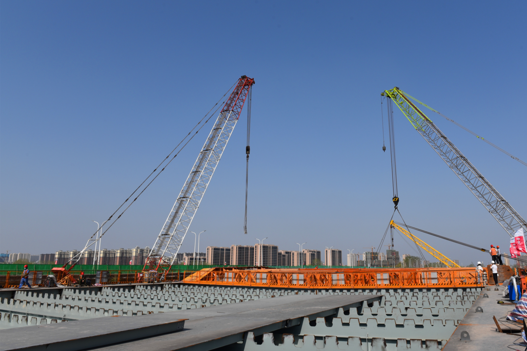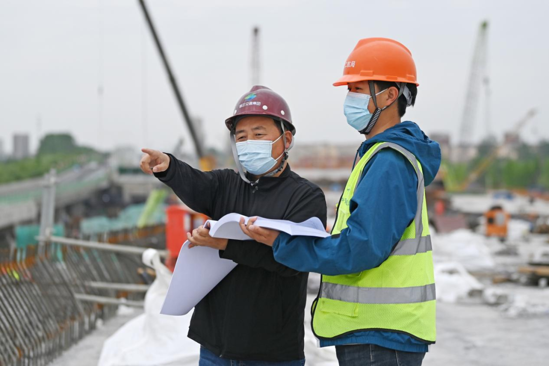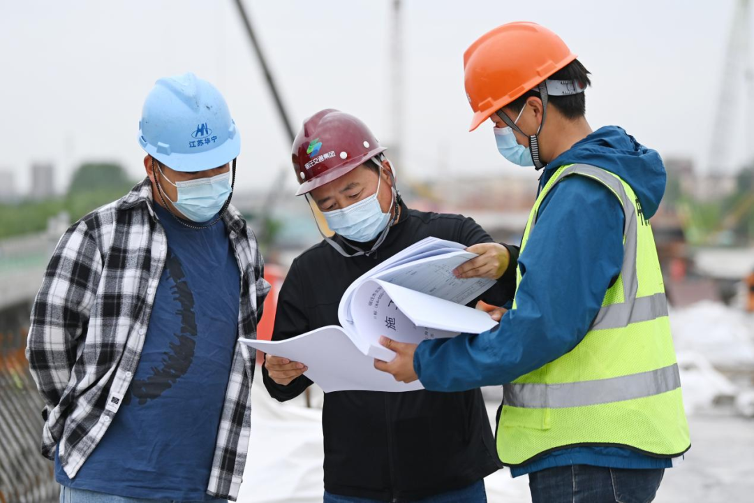 機(jī)器轟鳴、鋼架林立、塔吊聳立,5月1日,在北京路快速化改造工程跨京杭運(yùn)河特大橋施工現(xiàn)場(chǎng),建設(shè)工人戴著口罩不停穿梭于道路開(kāi)挖、管道鋪設(shè)、橋梁架構(gòu)等各個(gè)作業(yè)面,北京路快速化改造工程項(xiàng)目管理組組長(zhǎng)朱寶廣與技術(shù)員認(rèn)真核對(duì)圖紙,反復(fù)商討下一階段施工方案。