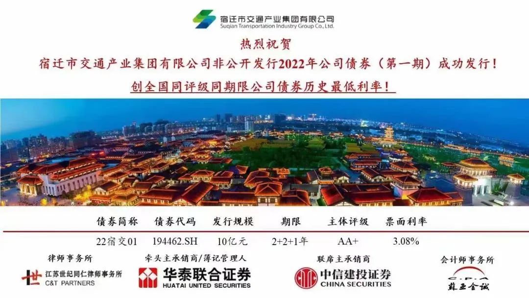 【喜訊】創(chuàng)全國最低!宿遷交通集團非公開發(fā)行2022年公司債券(第一期)成功發(fā)行