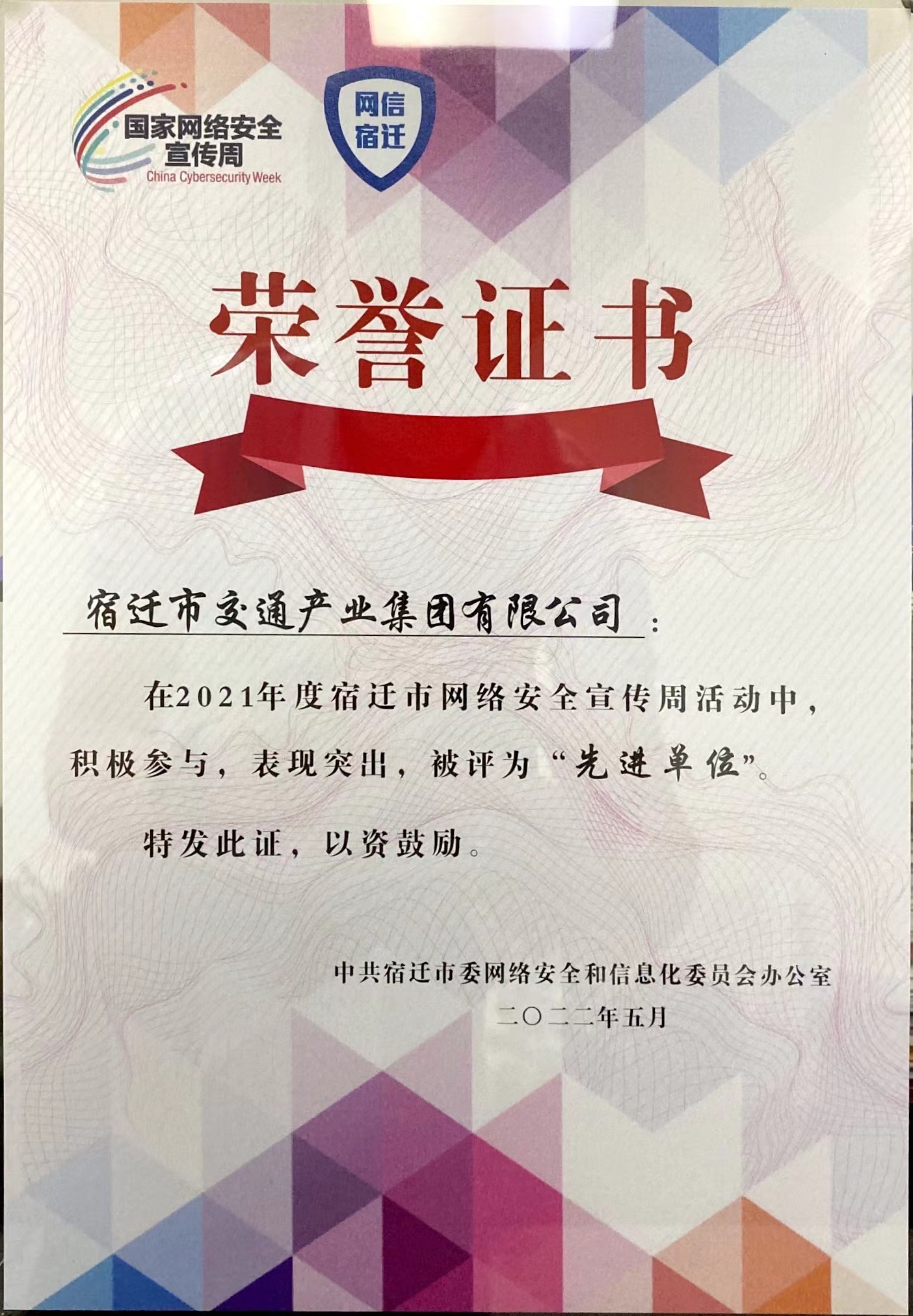 宿遷交通集團(tuán)榮獲2021年度宿遷市網(wǎng)絡(luò)安全宣傳周活動先進(jìn)單位