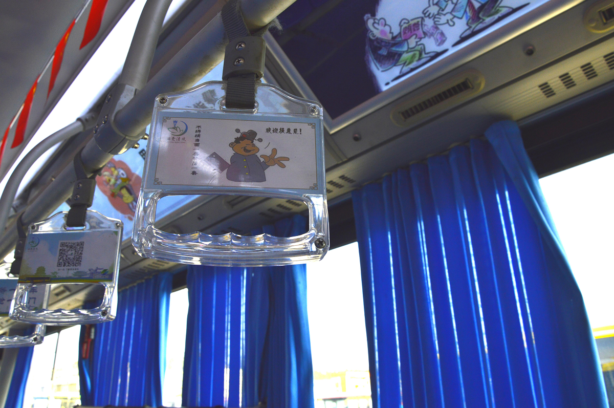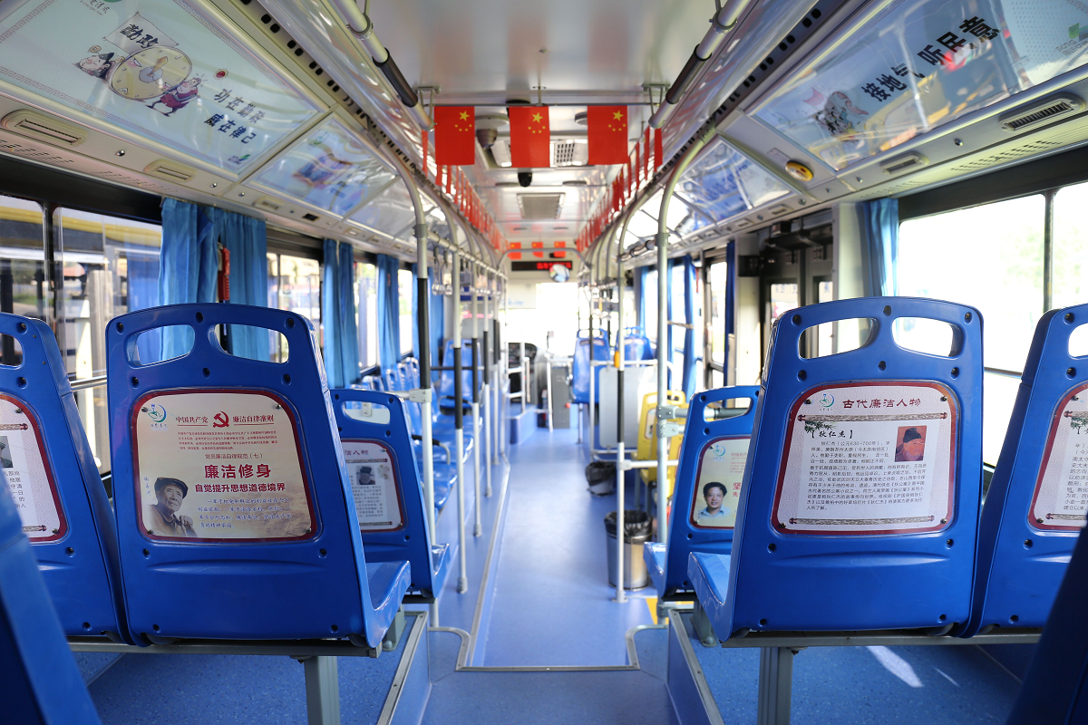 301路“西楚清風(fēng)號(hào)”公交車隊(duì)以“廉政文化”為車隊(duì)形象展示亮點(diǎn)。車廂內(nèi)部的宣傳燈箱和拉手吊環(huán)配以廉政漫畫和尚廉標(biāo)語,座椅背部放置古今廉政典范人物及事例的宣傳畫頁,車門頂部巧妙印有“開門納廉,關(guān)門拒腐”宣傳標(biāo)語。