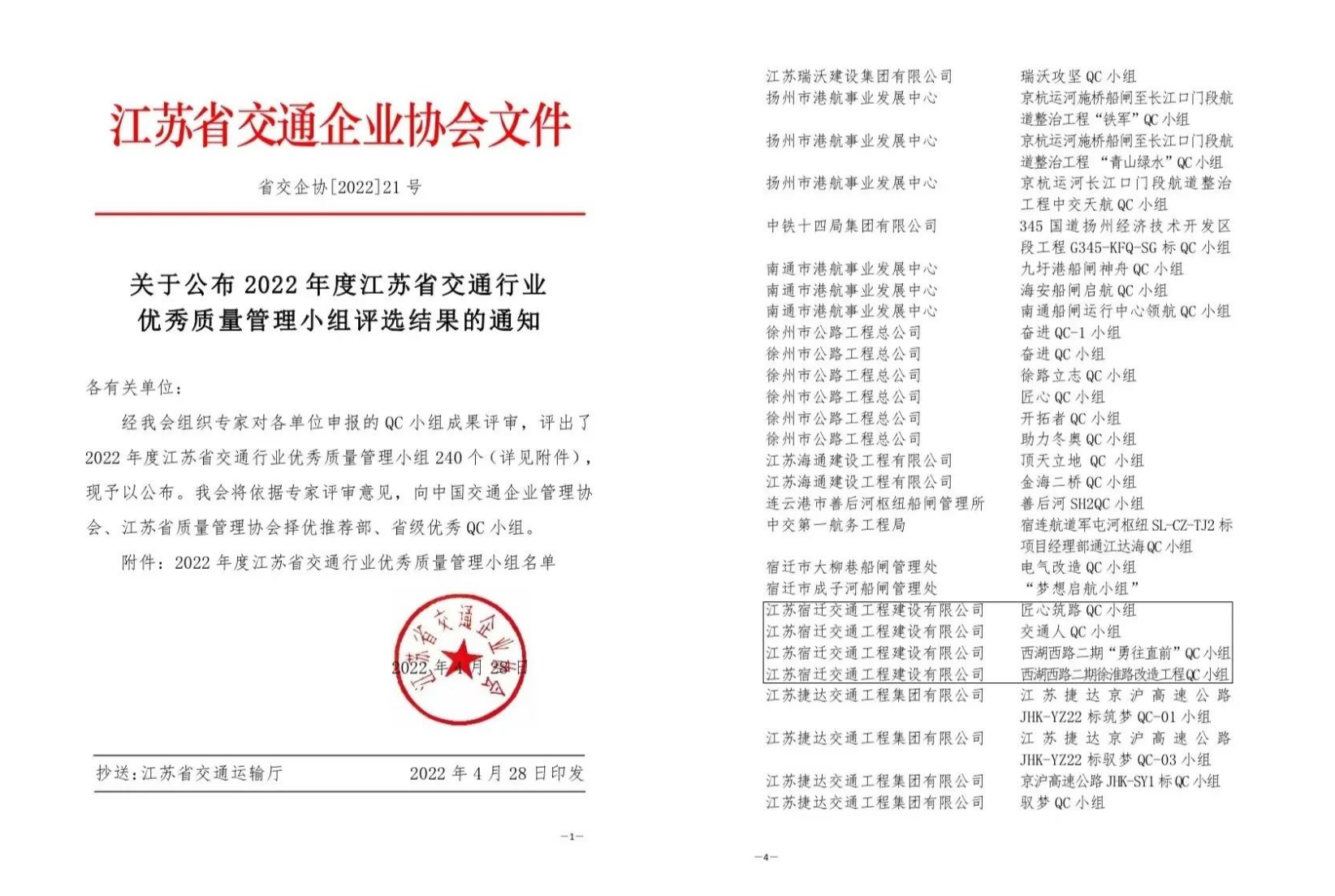 近日,江蘇省交通企業(yè)協(xié)會(huì)公布2022年度江蘇省交通行業(yè)優(yōu)秀質(zhì)量管理小組評(píng)選結(jié)果,宿遷交建徐淮路改造工程項(xiàng)目QC小組及“勇往直前”QC小組、匠心筑路QC小組、交通人QC小組榮獲“2022年江蘇省交通行業(yè)優(yōu)秀質(zhì)量管理小組”稱號(hào)。