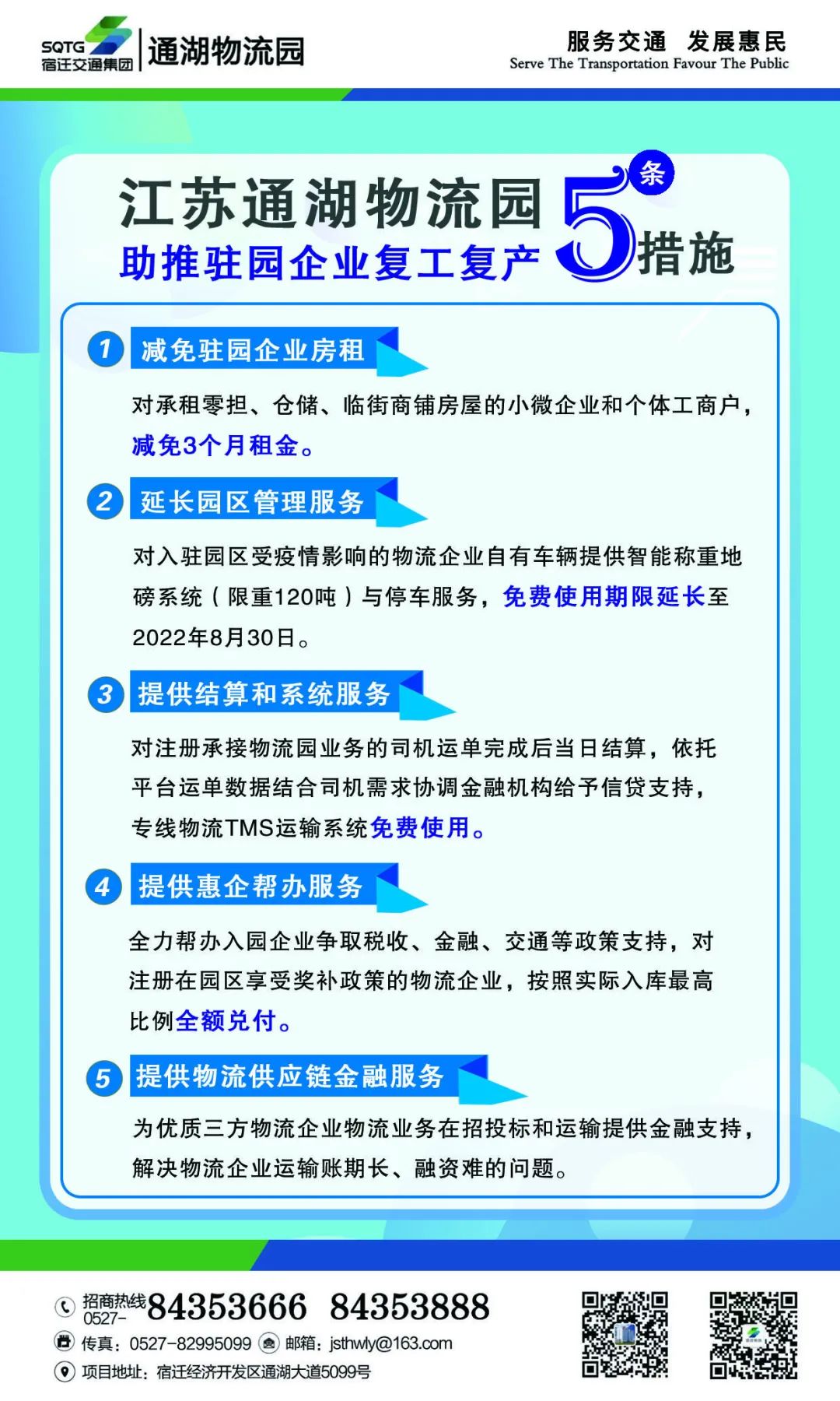 為積極應(yīng)對新冠肺炎疫情影響,近日,通湖物流園迅速響應(yīng)市委、市政府相關(guān)惠民措施,推出“惠企五條措施”,通過減免駐園企業(yè)房租、延長園區(qū)管理服務(wù)、提供結(jié)算和系統(tǒng)服務(wù)、提供惠企幫辦服務(wù)、提供物流供應(yīng)鏈金融服務(wù),助推駐園企業(yè)復(fù)工復(fù)產(chǎn)。