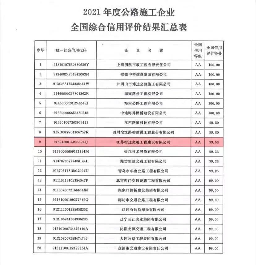 近日,中國交通運輸部公布了2021年度公路建設(shè)市場全國綜合信用評價企業(yè)名單。宿遷交建以99.53的高分再次獲評“2021年度公路施工企業(yè)全國綜合信用評價AA級”。