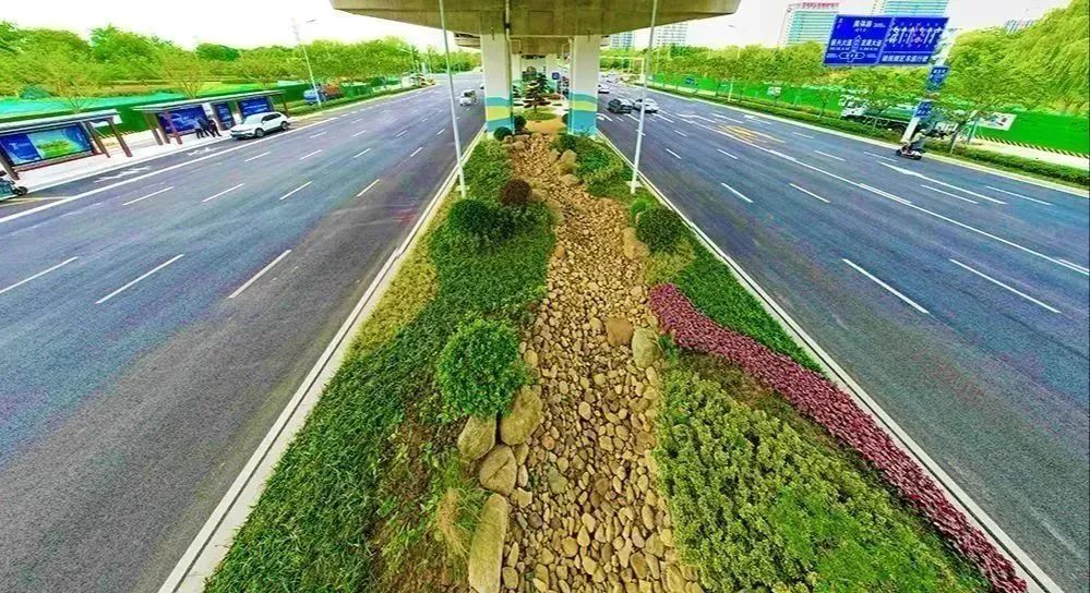 一步一景,已足以傾城。而迎賓大道二期快速化改造工程在景觀綠化施工中,還融入了海綿城市設(shè)計理念,在宿支路至濱河路、駱馬湖路至洪澤湖路、微山湖路至青海湖路,分別以山水、藍夢、仙蹤為主題,用泰山石、藍色玻璃石、紅色玻璃石、灰白礫石及海綿旱溪、花境、造型羅漢松、灌木球等進行巧妙搭配,實現(xiàn)景觀提升與“海綿城市”充分融合,打造流暢蜿蜒的綠色海綿線。