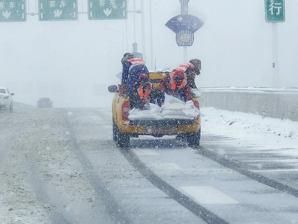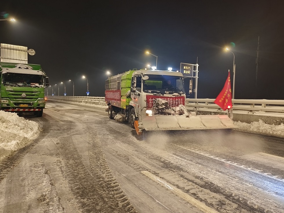 宿遷交建迅速啟動(dòng)應(yīng)急預(yù)案,快速出動(dòng)應(yīng)急養(yǎng)護(hù)人員200余人和雪鏟車(chē)3輛、滾雪車(chē)2輛、裝載機(jī)30輛、融雪劑灑布車(chē)3輛、托運(yùn)物資車(chē)輛18輛、巡查車(chē)13輛,投入融雪物資300噸,對(duì)所養(yǎng)護(hù)路段全面開(kāi)展除冰融雪作業(yè)。