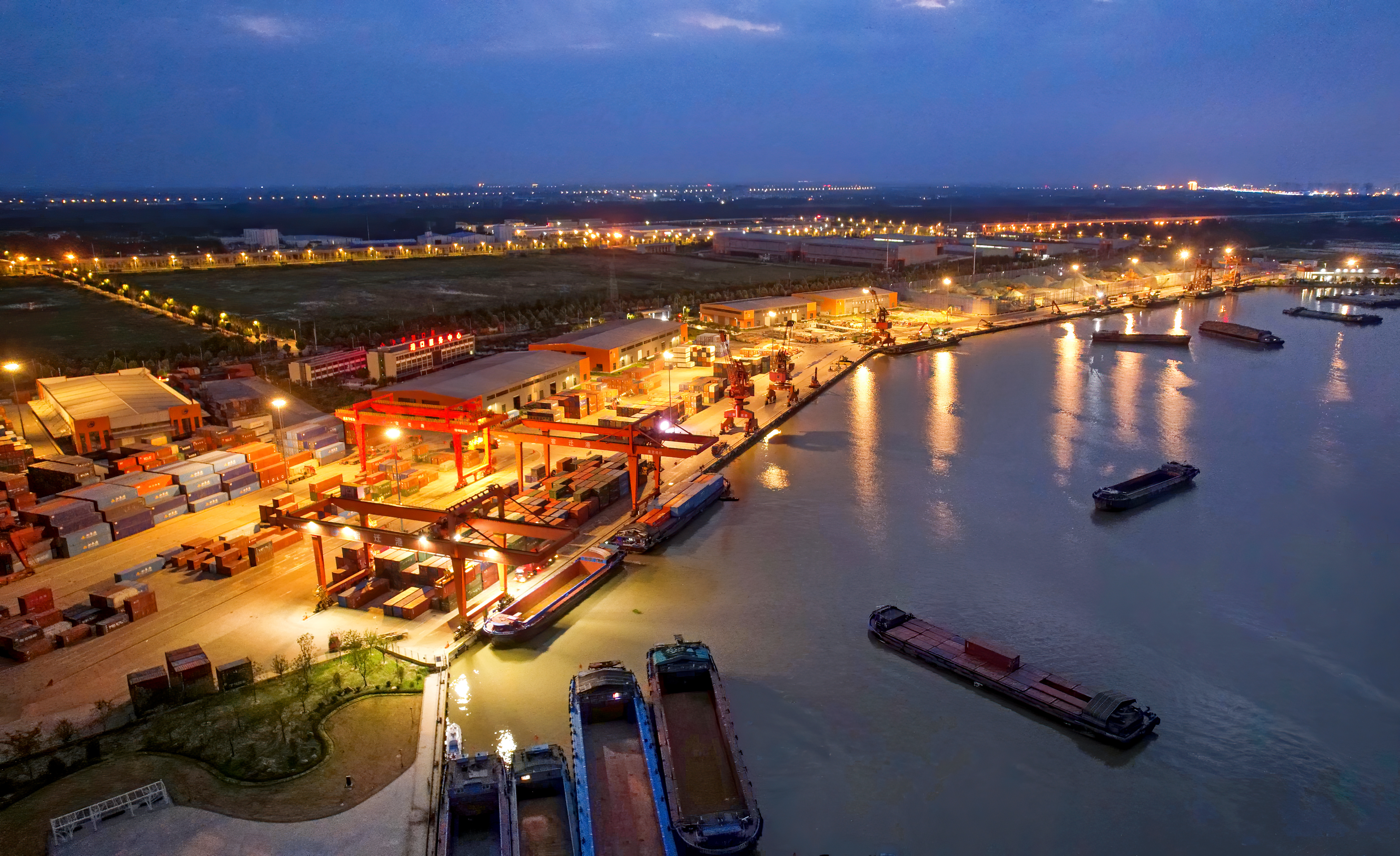 11月20日傍晚,宿遷港中心港區(qū)岸線燈火通明,工作人員挑燈夜戰(zhàn),機械設備忙碌穿梭,一派繁忙景象。