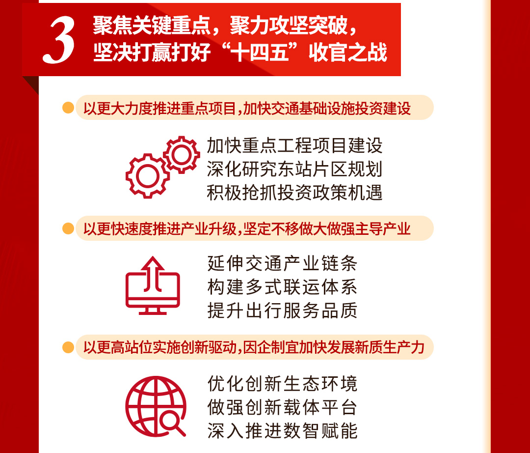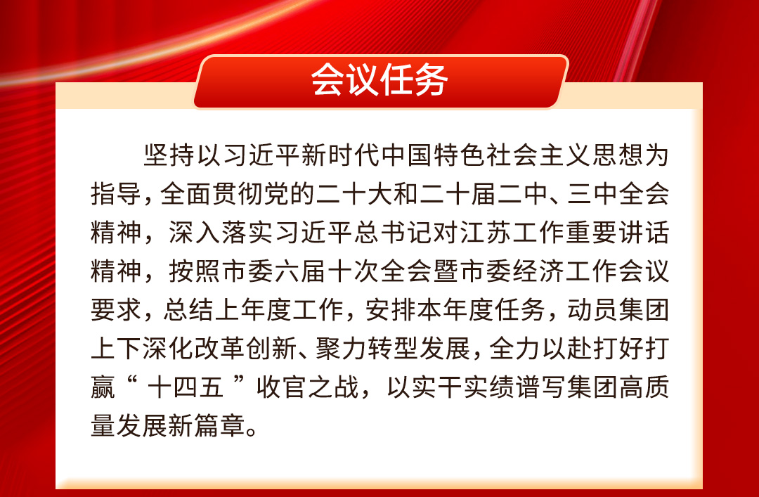 會議強調,2025年是“十四五”規(guī)劃收官之年和“十五五”規(guī)劃謀劃之年,也是集團轉型攻堅、加快發(fā)展的關鍵階段,集團上下要聚焦增強核心功能、提高核心競爭力,聚力“高標準建設、高能級創(chuàng)新、高品質服務、高效能治理、高水平安全、高質量發(fā)展”,以更大力度推進重點項目、加快交通基礎設施投資建設,以更快速度推進產業(yè)升級、堅定不移做大做強主導產業(yè),以更高站位實施創(chuàng)新驅動、因企制宜加快發(fā)展新質生產力,以更實舉措推動提質增效、多措并舉優(yōu)存量拓增量穩(wěn)增長,以更強氣魄深化改革提升、深度激發(fā)企業(yè)發(fā)展的內生動力,以更嚴要求防范化解風險、著力鞏固高質量發(fā)展的堅強屏障,全力推動發(fā)展速度合理增長、產業(yè)結構不斷優(yōu)化、質量效益持續(xù)提升,奮力開創(chuàng)高質量發(fā)展新局面,為全面推進中國式現(xiàn)代化宿遷新實踐作出新的更大貢獻。