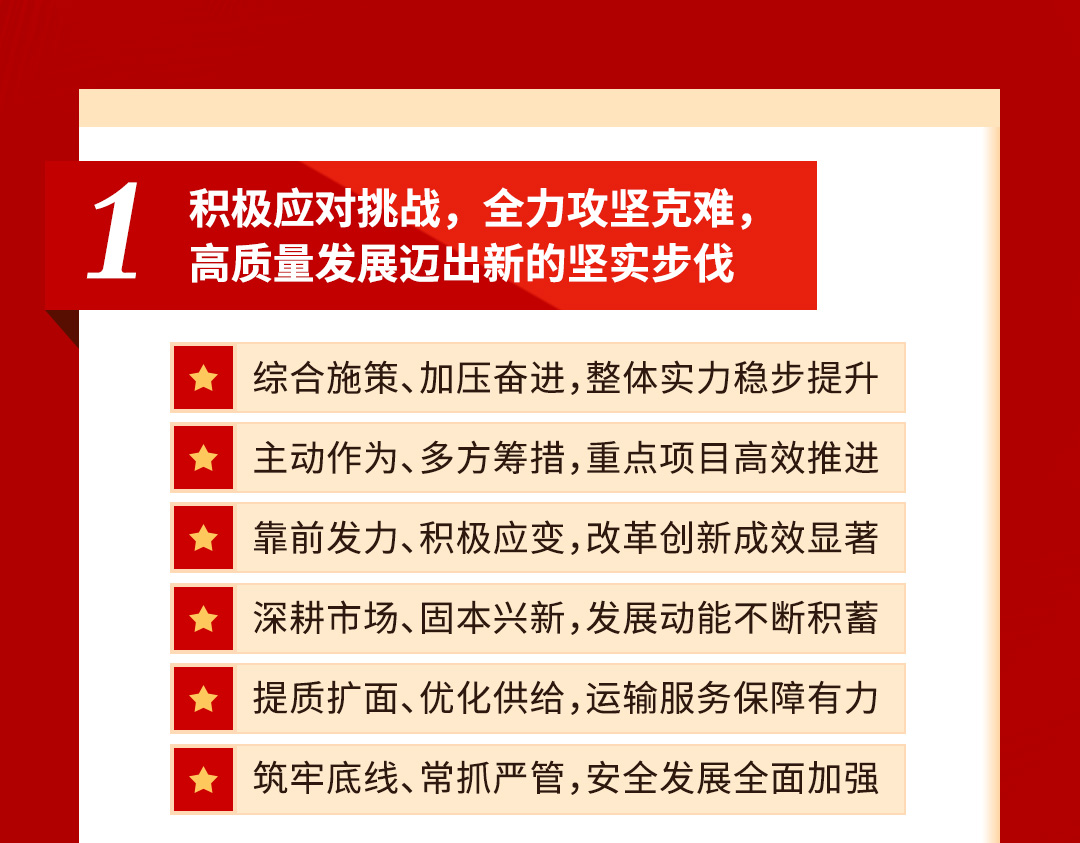 2024年,集團堅持以習近平新時代中國特色社會主義思想為指導,全面貫徹落實市委、市政府部署要求,綜合施策、加壓奮進,整體實力穩(wěn)步提升;主動作為、多方籌措,重點項目高效推進;靠前發(fā)力、積極應變,改革創(chuàng)新成效顯著;深耕市場、固本興新,發(fā)展動能不斷積蓄;提質擴面、優(yōu)化供給,運輸服務保障有力;筑牢底線、常抓嚴管,安全發(fā)展全面加強,扎實推動各項工作取得新進展新成效。