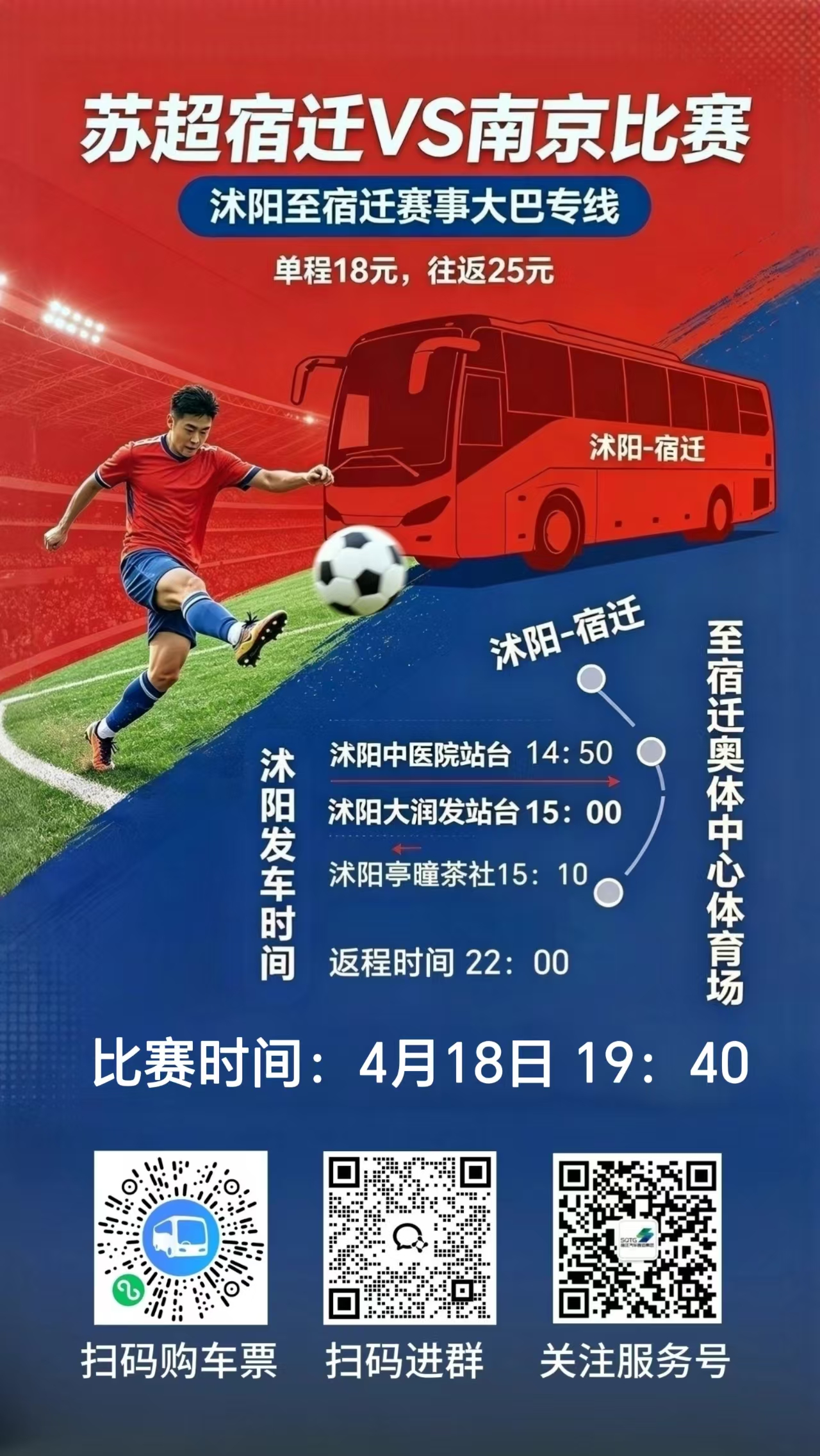 4月18日,為方便沭陽球迷輕松奔赴綠茵賽場,宿汽集團開通沭陽至宿遷奧體中心直通車,可通過線上“巴士管家”小程序、宿汽出行公眾號、線下乘車購票。