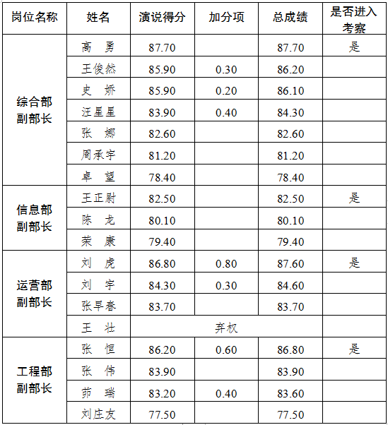 根據(jù)《宿遷交通集團所屬單位2022年度中層管理人員競聘實施方案》的安排,競聘演說工作已經(jīng)結(jié)束,現(xiàn)將競聘總成績及進入組織考察人員名單公布如下。